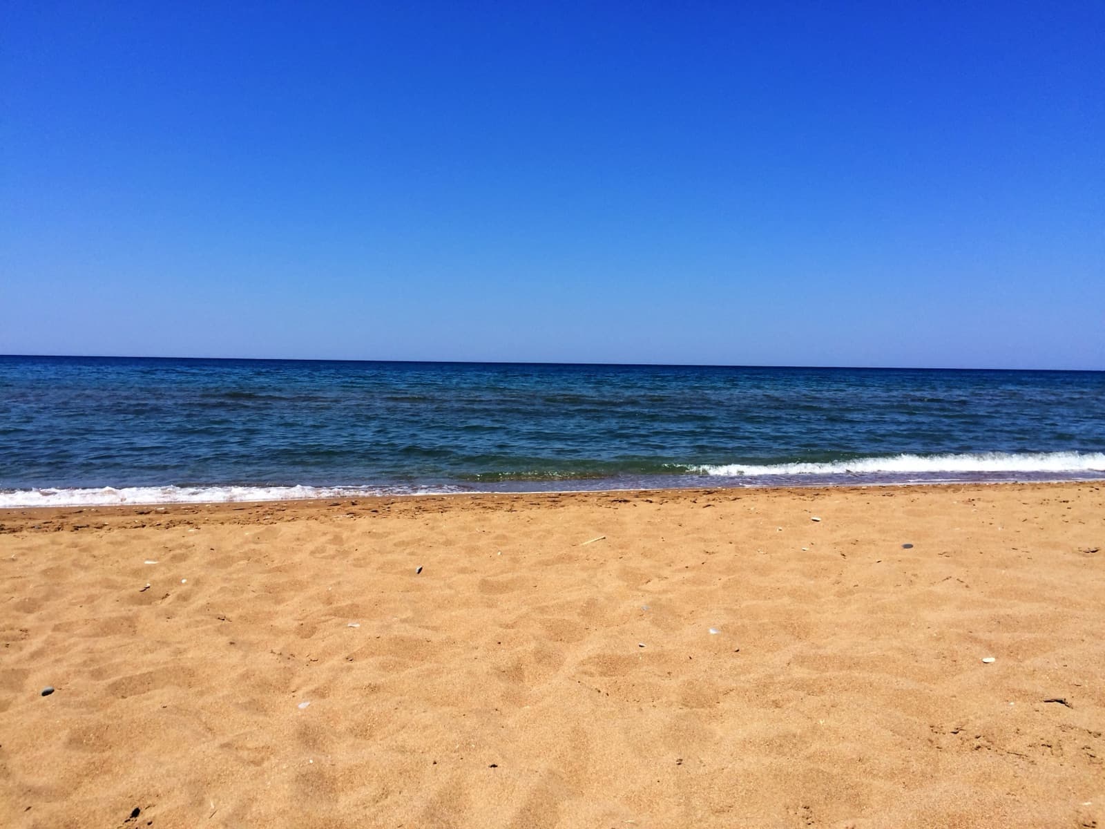 Two kilometres of crescent sand, facing west into the Ionian. Aleppo pines grow to the edge of the dune line. A river delta feeds the southern end. Surf rolls in from the open sea between November and April — proper barrels, the kind surfers plan trips around.